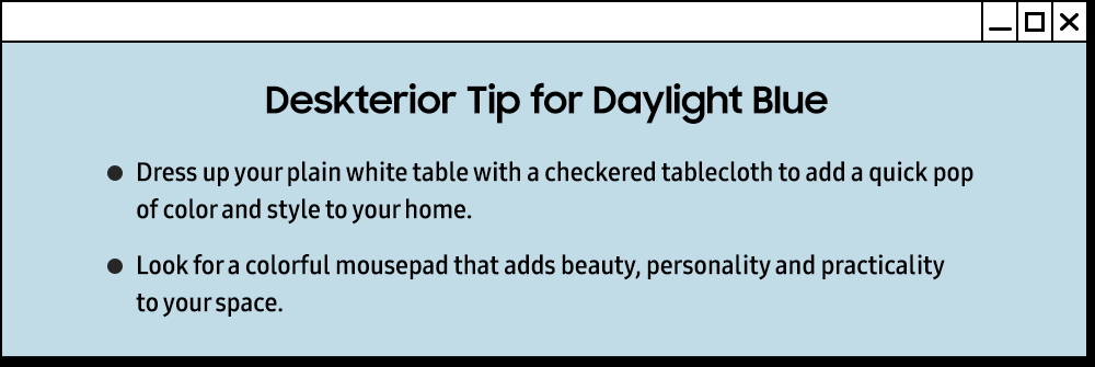 Dzięki Smart Monitor M8 możesz udekorować przestrzeń dedykowaną swoim ulubionym hobby w kolorze Daylight Blue. Wzbogać swój pokój pamiątkami z podróży, bibelotami lub gadżetami celebrytów w uzupełniających odcieniach niebieskiego, aby stworzyć idealne biurko, które wyraża Twoją wyjątkową osobowość.