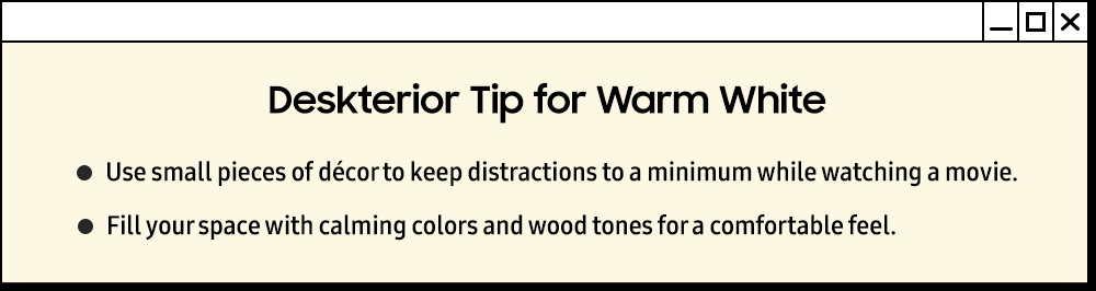 Po długim dniu pracy przesyłanie strumieniowe ulubionych filmów w domu to świetny sposób na relaks i doładowanie. Aby stworzyć ciepłą i zachęcającą atmosferę, połącz ciepły biały kolor monitora z drewnianymi akcentami.