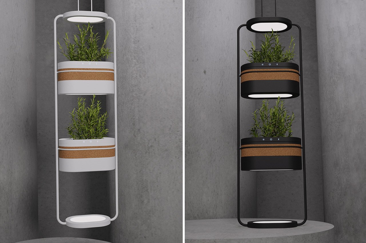 Lampa ma neo-przemysłową estetykę i ma powierzchnię, na której można postawić donicę. Nad nim znajduje się lampa o regulowanej wysokości, wyposażona w diody LED o pełnym spektrum, które naśladują jakość światła (kolor), natężenie światła (jasność) i fotoperiod (czas trwania) słońca, umożliwiając każdej roślinie wzrost w pomieszczeniu.