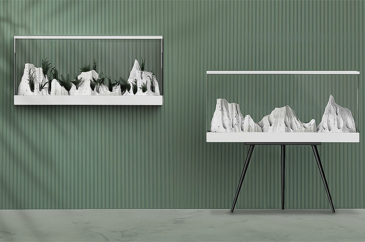 Vista to inteligentny system ogrodniczy, który wykorzystuje hydroponikę do uprawy bujnej zieleni na tacy wzrostu, która naśladuje naturalny teren górskiego krajobrazu.