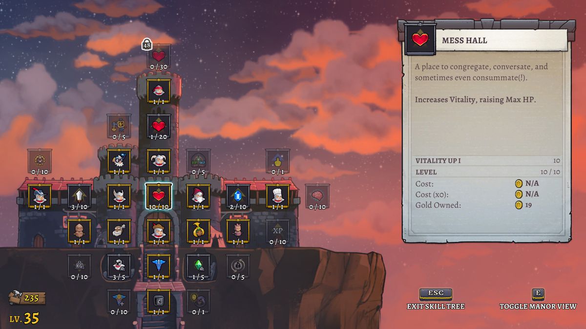 Bardzo wcześnie Rogue Legacy 2Twoim głównym celem powinno być zgarnięcie jak największej ilości złota podczas kilku pierwszych bezlitosnych biegów. Zaczniesz odblokowywać nowe korzyści, budując swój zamek, ale na razie skup się na ulepszaniu zdrowia i odblokowywaniu nowych klas tak szybko, jak to możliwe.