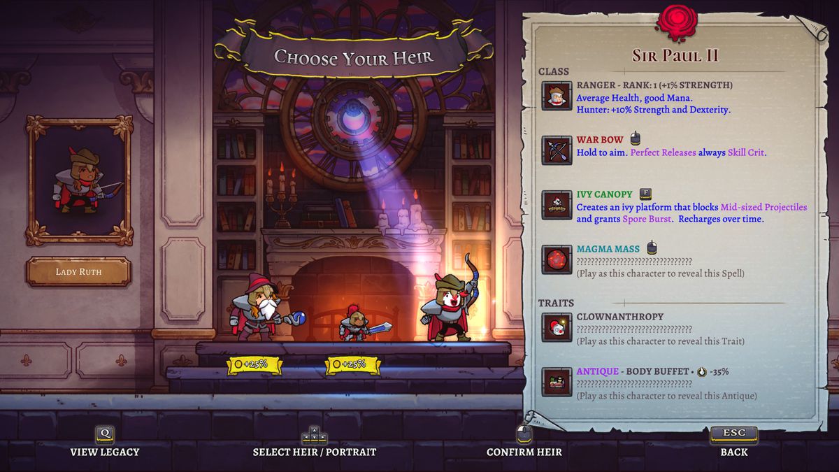 Wybierając swojego dziedzica, będziesz mieć do czynienia z różnymi losowo generowanymi opcjami — ich klasą, zaklęciami, talentami i innymi losowymi pamiątkami, które się z nimi pojawią. Może to również obejmować cechy, które mogą utrudnić ci bieganie w zamian za większy procent zebranego złota.