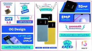 Poco M4 5G obsługuje MIUI 13 oparty na systemie Android 12 i jest dostępny w dwóch konfiguracjach pamięci – 4 GB/64 GB i 6 GB/128 GB. Posiada również dedykowane gniazdo kart microSD do rozszerzenia pamięci do 512 GB.