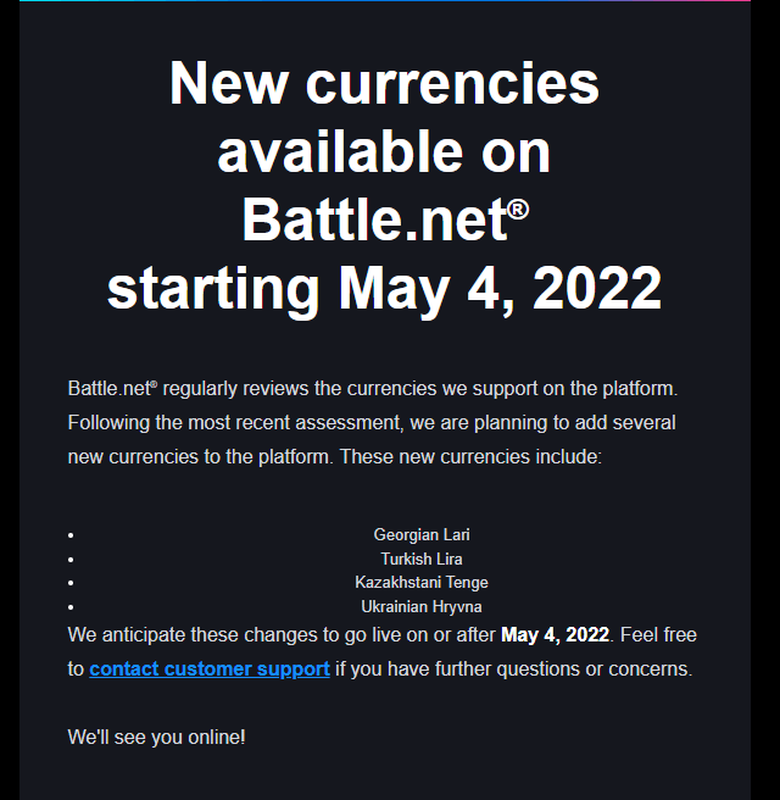 Blizzard od marca szuka możliwości dostarczenia graczy z Ukrainy, Gruzji, Turcji i Kazachstanu, aby płacić za zakupy w ich walucie krajowej. Teraz będzie to możliwe od 4 maja.