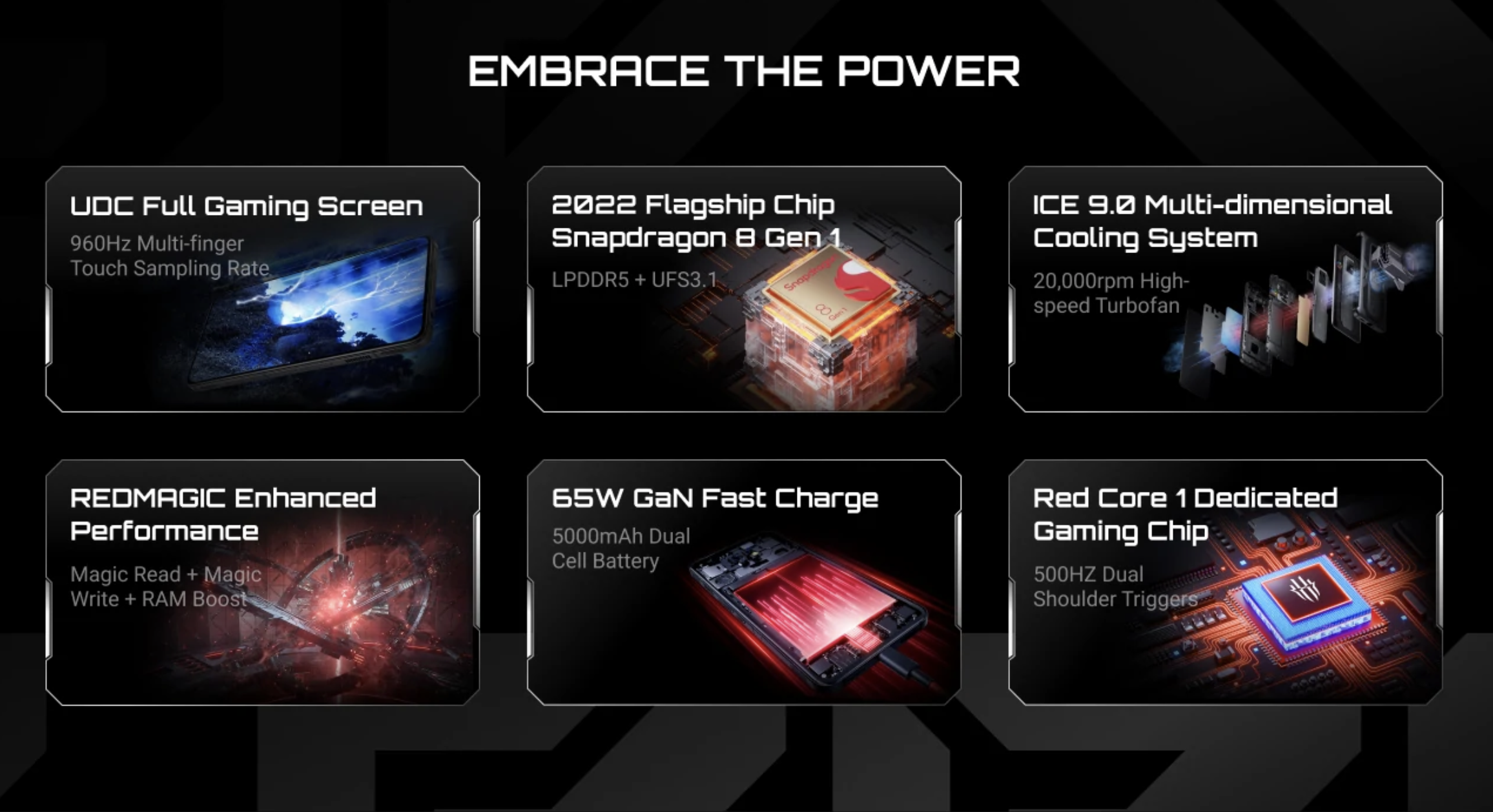 Z ciekawych rzeczy w nowości jest 9-warstwowy system chłodzenia, podświetlany wentylator RGB, który obraca się z prędkością 20 000 obr./min, a także autorski układ Red Core 1. Odpowiada za sterowanie dźwiękiem, obrazem i reakcją warstwy dotykowej. Wyzwalacze czujników są zainstalowane po prawej stronie obudowy smartfona. Nowość działa na systemie operacyjnym Android 12.