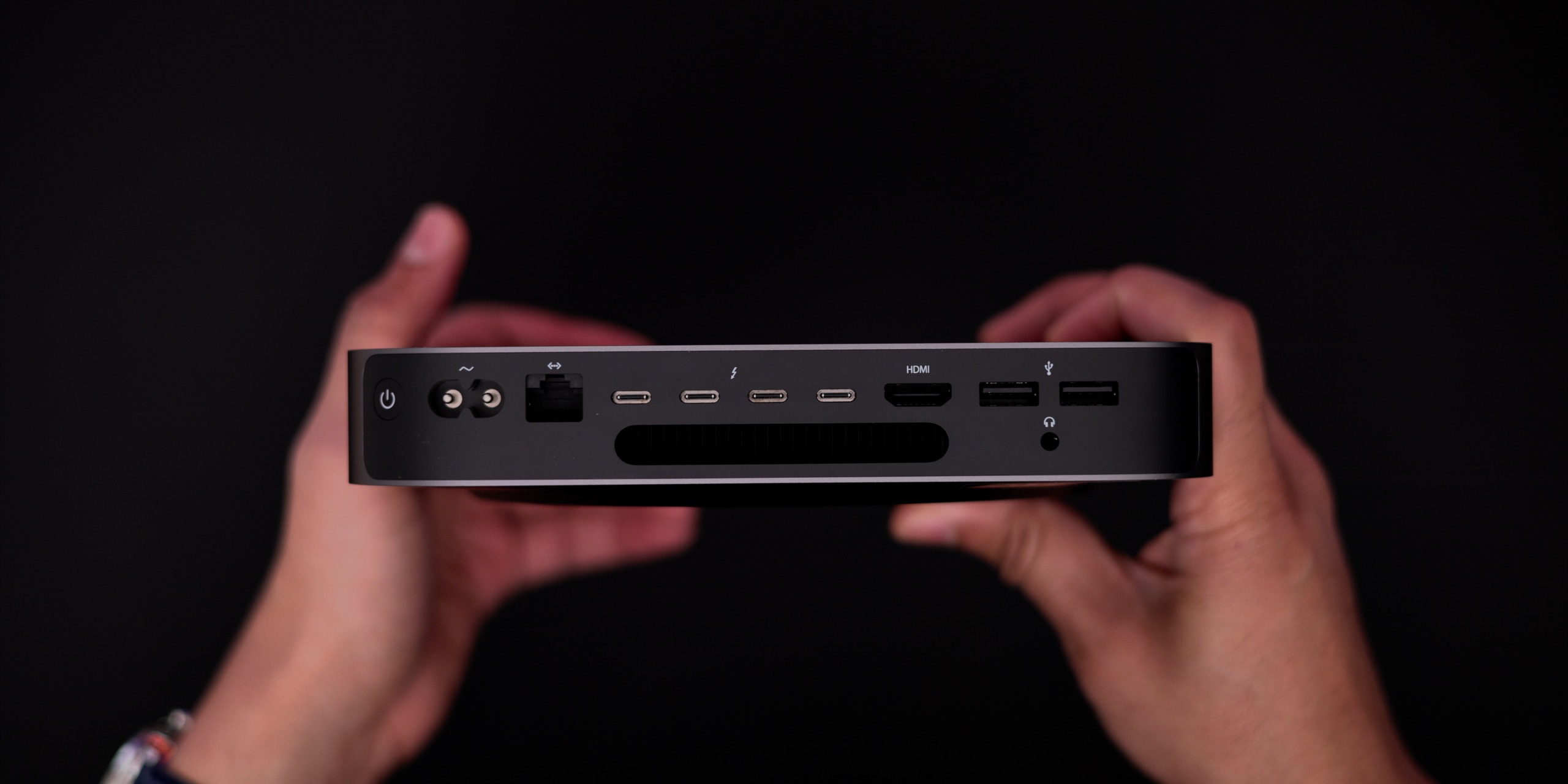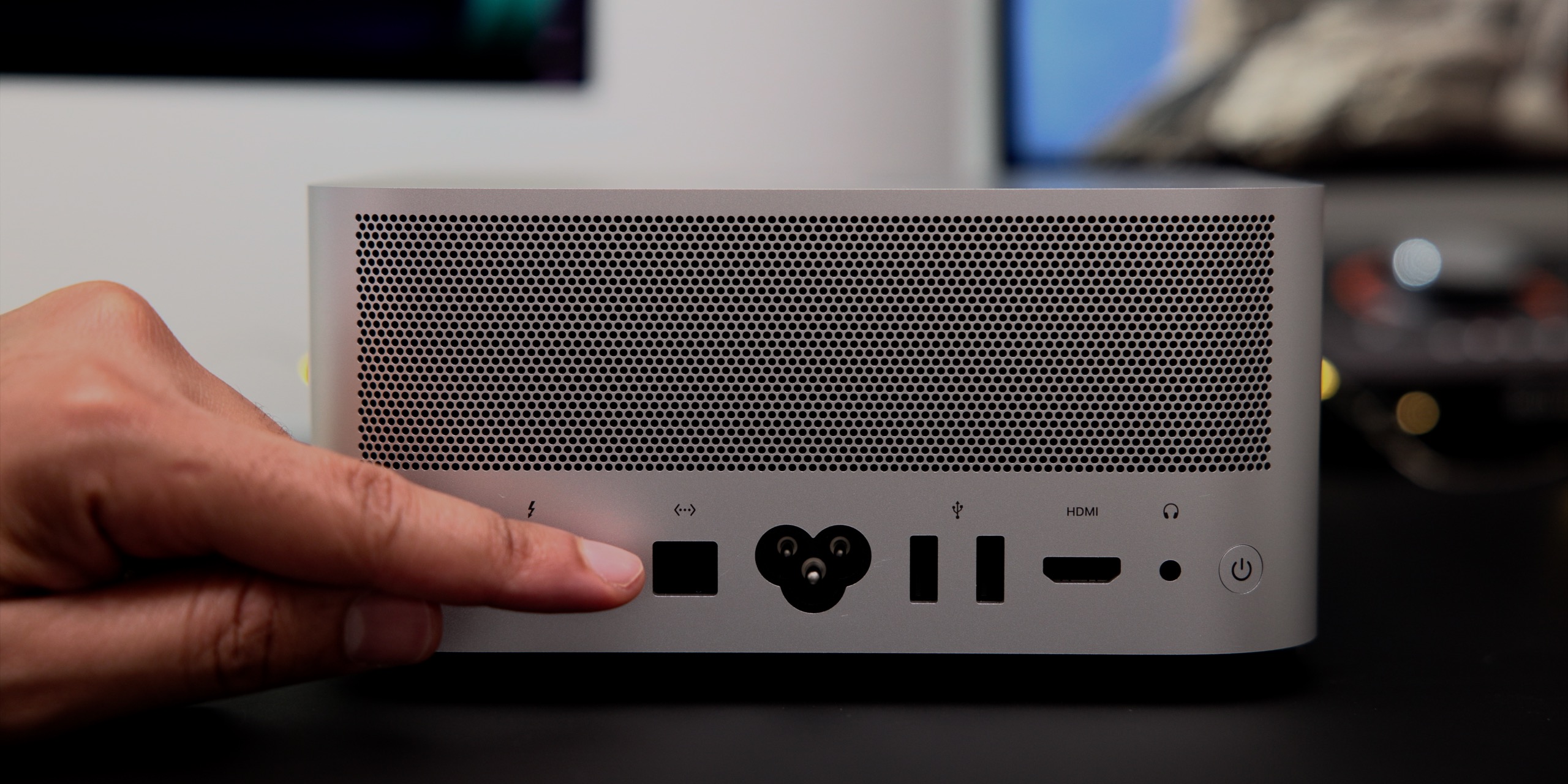 Nie zwariowałbyś, gdybyś pomyślał, że patrzysz na tył komputera Intel Mac mini, patrząc na tylną część Mac Studio. Poza rozmieszczeniem portów typ I/O jest bardzo podobny. Mac Studio jest wyposażony w cztery porty Thunderbolt 4 / USB 4 z tyłu, port 10GbE, dwa porty USB-A, port HDMI 2.0 i wyjście słuchawkowe 3,5 mm.
