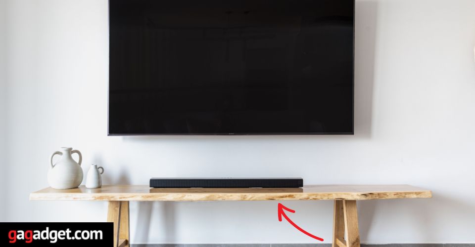 Niektóre modele soundbarów można zamocować bezpośrednio na podstawie telewizora. Jeśli umieścisz panel wewnątrz szafki/stojaka, upewnij się, że jest on maksymalnie wysunięty do przodu, a boczne i tylne ściany nie zakłócają dźwięku. Oczywiste jest również, że przed soundbarem nie powinny znajdować się żadne obce przedmioty ani przeszkody, takie jak ściany szafki lub drzwi.