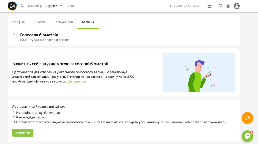 Głos możesz utworzyć w oddziale banku, na czacie Help Online, dzwoniąc pod numer 3700 lub w internetowej wersji aplikacji Privat24 (sekcja Bezpieczeństwo - Biometria głosu).