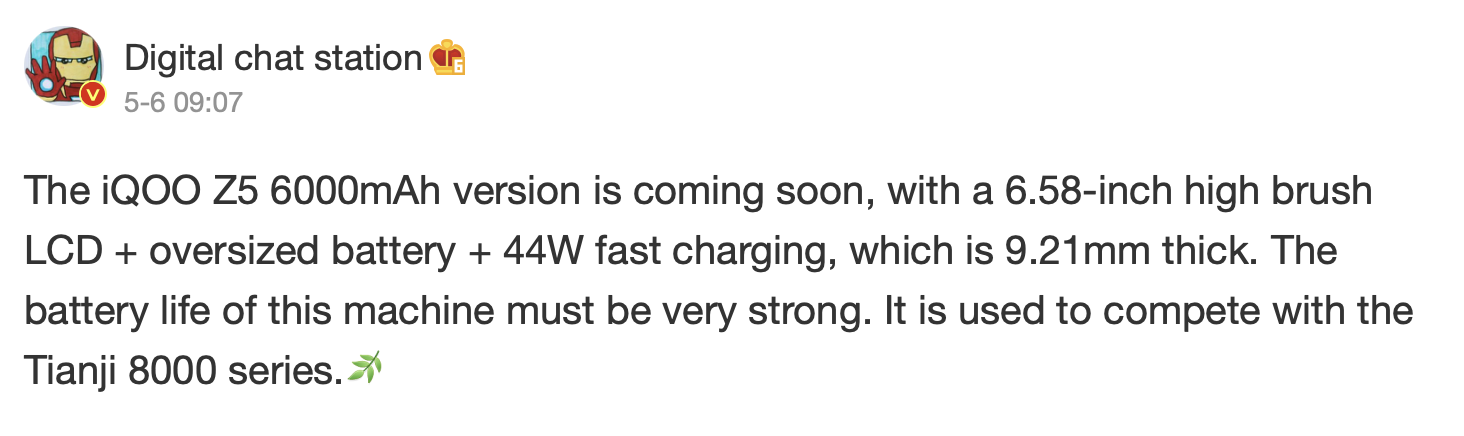 To jest nowa wersja iQOO Z5. Według znawcy Digital Chat Station, nowy Wola różnią się od poprzedniego modelu baterią powiększoną do 6000 mAh. Dostanie wsparcie dla szybkiego ładowania 44W.