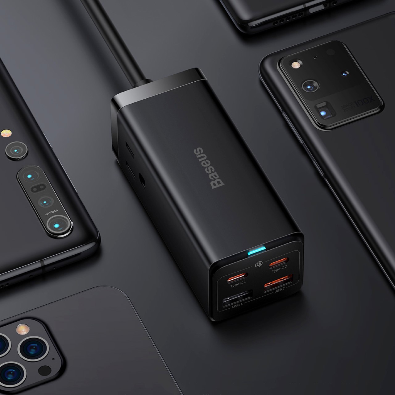 Nawet teraz, kiedy mówię, obok mnie siedzą dwie pary listew zasilających. Jeden z gniazdami do podłączenia laptopa, inteligentnego głośnika i diod LED, a drugi do urządzeń zasilanych przez USB, takich jak moja bezprzewodowa ładowarka i stacja dokująca do mojego zegarka Apple Watch. Byłem dość drobiazgowy, jak umieścić te listwy zasilające, aby nie zaśmiecały mojego biurka, ale prawdę mówiąc, wyglądają koszmarnie, z liczbą kabli wchodzących w nie i wychodzących z nich. Baseus cię wspiera, jeśli jesteś podobny do mnie. Tragedią związaną z posiadaniem większej liczby gadżetów jest również konieczność radzenia sobie z większą liczbą kabli do ładowania tych gadżetów. Tę tragedię dodatkowo potęguje możliwość, że być może nie masz wystarczającej liczby gniazdek elektrycznych, aby wszystkie gadżety były ładowane w tym samym czasie. Hub ładujący USB-C Baseus 65W GaN III rozwiązuje większość tych problemów, łącząc wszystkie kable zasilające i cegły w jednym urządzeniu. Zaprojektowany jako monolityczna jednostka, która znajduje się na biurku, hub ładujący Baseus 65W GaN III USB-C (tak, nazwa to garść) umożliwia podłączenie laptopa, drukarki, tabletu, smartfona, smartwatcha, słuchawek TWS i wielu innych urządzeń do niego… jednocześnie. Podobnie jak listwa zasilająca na sterydach, zarządza zapotrzebowaniem na energię wszystkich Twoich urządzeń, jednocześnie zmniejszając liczbę potrzebnych ładowarek, adapterów i cegieł zasilających. Ten jeden klocek poradzi sobie z nimi wszystkimi.