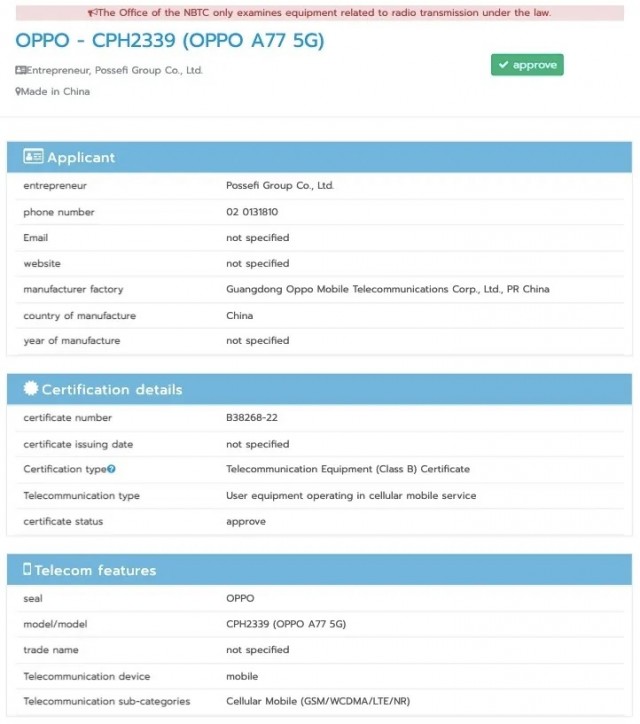 Tajski urząd certyfikujący nie ujawnia specyfikacji Oppo A77 5G, ale można oczekiwać, że będzie on wyposażony w nowoczesny design i ulepszenia w stosunku do modelu 4G.