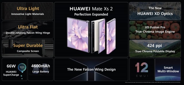 Pomimo dużego rozmiaru Mate Xs 2 waży 255 gramów – znacznie mniej niż jego poprzednik – Mate Xs (300g) i Mate X2 Huawei (295g). Nowy Mate Xs 2 jest zasilany przez chipset Qualcomm Snapdragon 888 4G i jest dostarczany z pojedynczą pamięcią RAM o pojemności 8 GB i 512 GB.