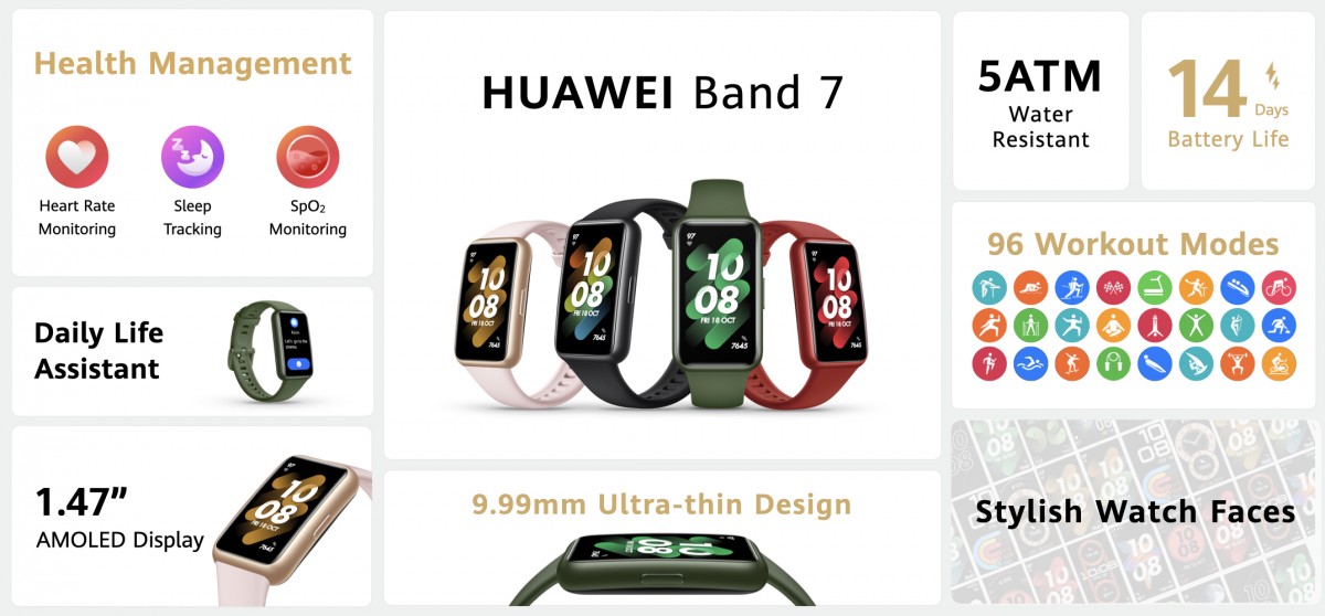 Watch Fit 2 to bardziej przystępny cenowo produkt z trwałą baterią i eleganckim wyglądem. Zegarek D stawia na pierwszym miejscu śledzenie zdrowia dzięki monitorom ciśnienia krwi i EKG, podczas gdy Band 7 to najtańszy produkt z cienką i lekką konstrukcją oraz dwutygodniowym czasem pracy na baterii.