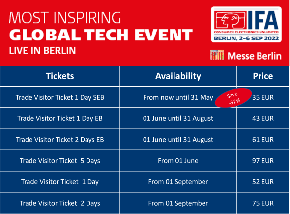 Jeśli chcesz osobiście zobaczyć targi IFA Berlin 2022, możesz kupić bilet „super-wczesny” – tylko 35 euro do końca miesiąca. Możesz kupić jeden online od sklep z biletami (uwaga: oferta 35 € dotyczy biletu jednodniowego).