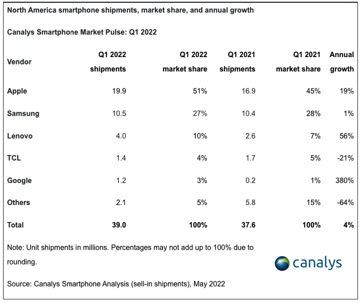 Najnowszy raport z Kanały koncentruje się na rynku smartfonów w Ameryce Północnej. W szczególności szacowane dostawy na I kwartał 2022 r. są już dostępne i zauważono pewne trendy. Na początek ogólny rynek smartfonów wzrósł o 4% do 39 milionów sprzedanych egzemplarzy w porównaniu z 37,6 milionami dostarczonymi w tym samym kwartale ubiegłego roku. Dzieje się tak pomimo „presji inflacyjnej”.