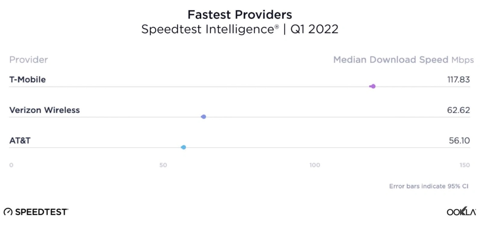 Oto porównanie trzech głównych przewoźników w porównaniu ze średnimi prędkościami w USA w badaniach Ookla i Opensignal na początku 2022 r.: