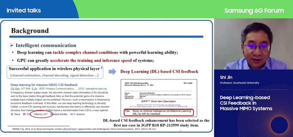 Ostatnią przemowę tego dnia wygłosił Shi Jin, profesor Uniwersytetu Południowo-Wschodniego w Chinach. W swoim przemówieniu zatytułowanym „Informacje zwrotne CSI oparte na głębokim uczeniu w masywnych systemach MIMO” profesor Jin podkreślił wyzwania związane ze stosowaniem technologii AI/ML w ogromnych systemach MIMO, a także sposoby ich rozwiązania. „W ciągu ostatnich 10 lat głębokie uczenie się osiągnęło wielki sukces w wielu dziedzinach” – zauważył profesor Jin. „Zainspirowani tym sukcesem, głębokie uczenie zostało wprowadzone do komunikacji bezprzewodowej, a nasza praca — oparte na głębokim uczeniu informacje zwrotne CSI — stały się popularnym tematem w badaniach nad 6G”.