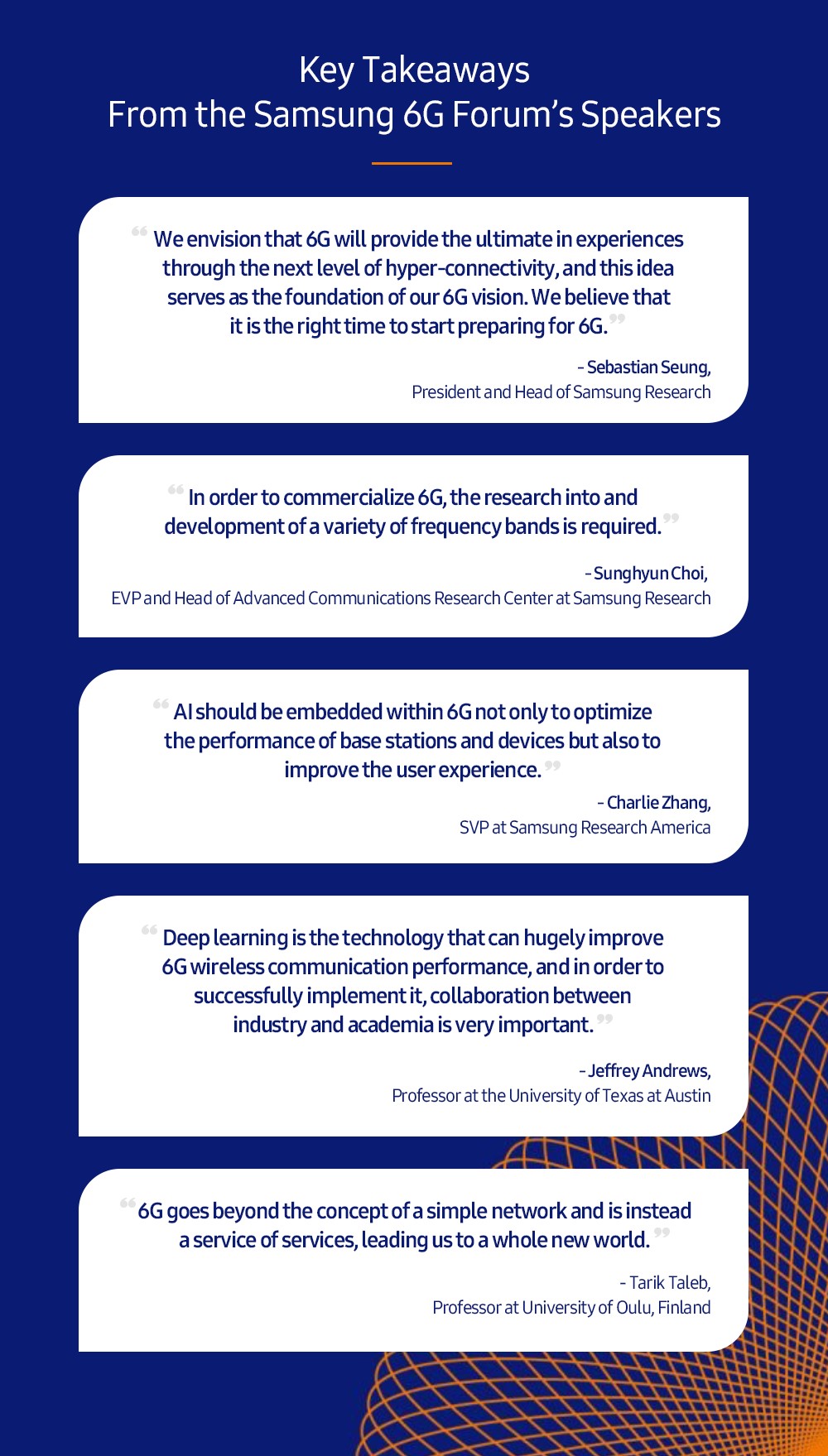 13 maja firma Samsung Electronics zorganizowała swój pierwszy Forum Samsung 6G pod hasłem „Następne hiperpołączone doświadczenie dla wszystkich”. Forum, które było transmitowane na żywo, zostało podzielone na dwie sesje, z poranną sesją „6G Air Interface” i popołudniową sesją „Intelligent Network for 6G”.