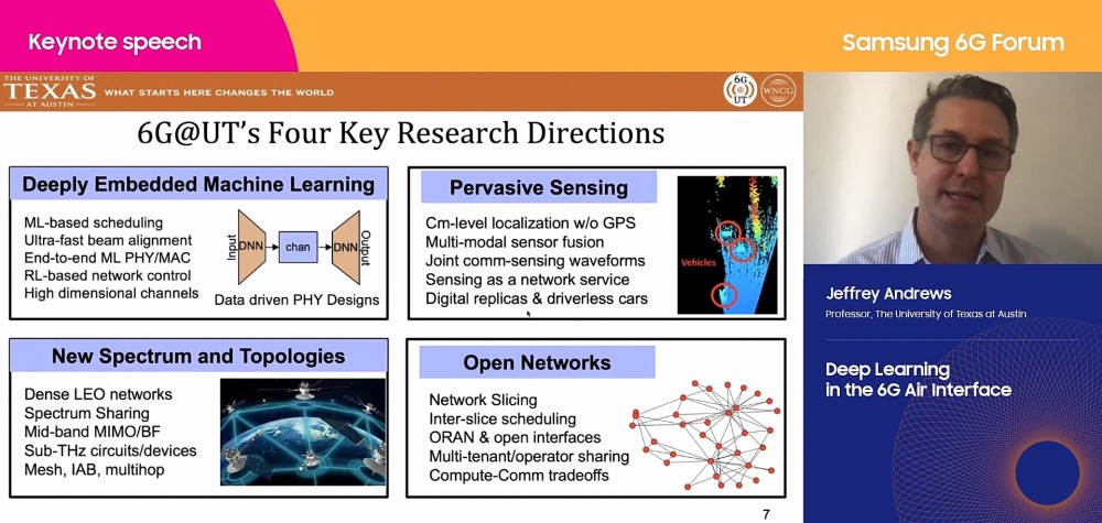 Otwierając poranną sesję 6G Forum, Jeffrey Andrews, profesor na University of Texas w Austin, wygłosił przemówienie zatytułowane „Głębokie uczenie się w interfejsie powietrznym 6G”. W tym przemówieniu Andrews skupił się na roli uczenia maszynowego w komunikacji nowej generacji, w tym na tym, jak komunikacja 6G może poprawić wydajność interfejsu powietrznego poprzez głębokie uczenie, a także na tym, jak można oczekiwać, że bardziej wnikliwe uczenie maszynowe przekroczy obecne ograniczenia Technologie 5G. „Aby z powodzeniem zastosować uczenie maszynowe w 6G i 5G, musimy oczywiście rozumieć zarówno komunikację bezprzewodową, jak i podstawy uczenia maszynowego” – podkreślił profesor Andrews. „Niezbędna jest dla nas współpraca, aby poczynić postępy w tym temacie i wykonywać nowatorskie prace”.