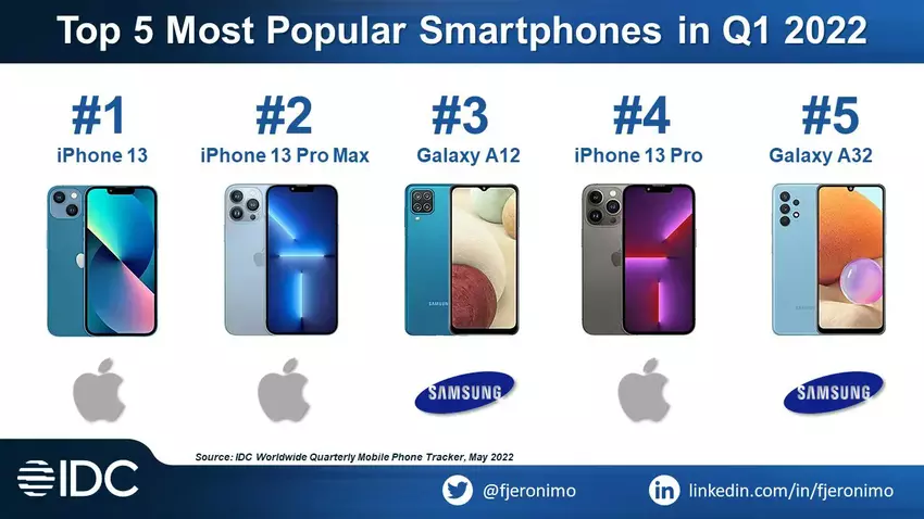 Agencja IDC opublikował listę najlepiej sprzedających się smartfonów w pierwszym kwartale 2022 roku. Obejmuje pięć modeli od dwóch producentów.