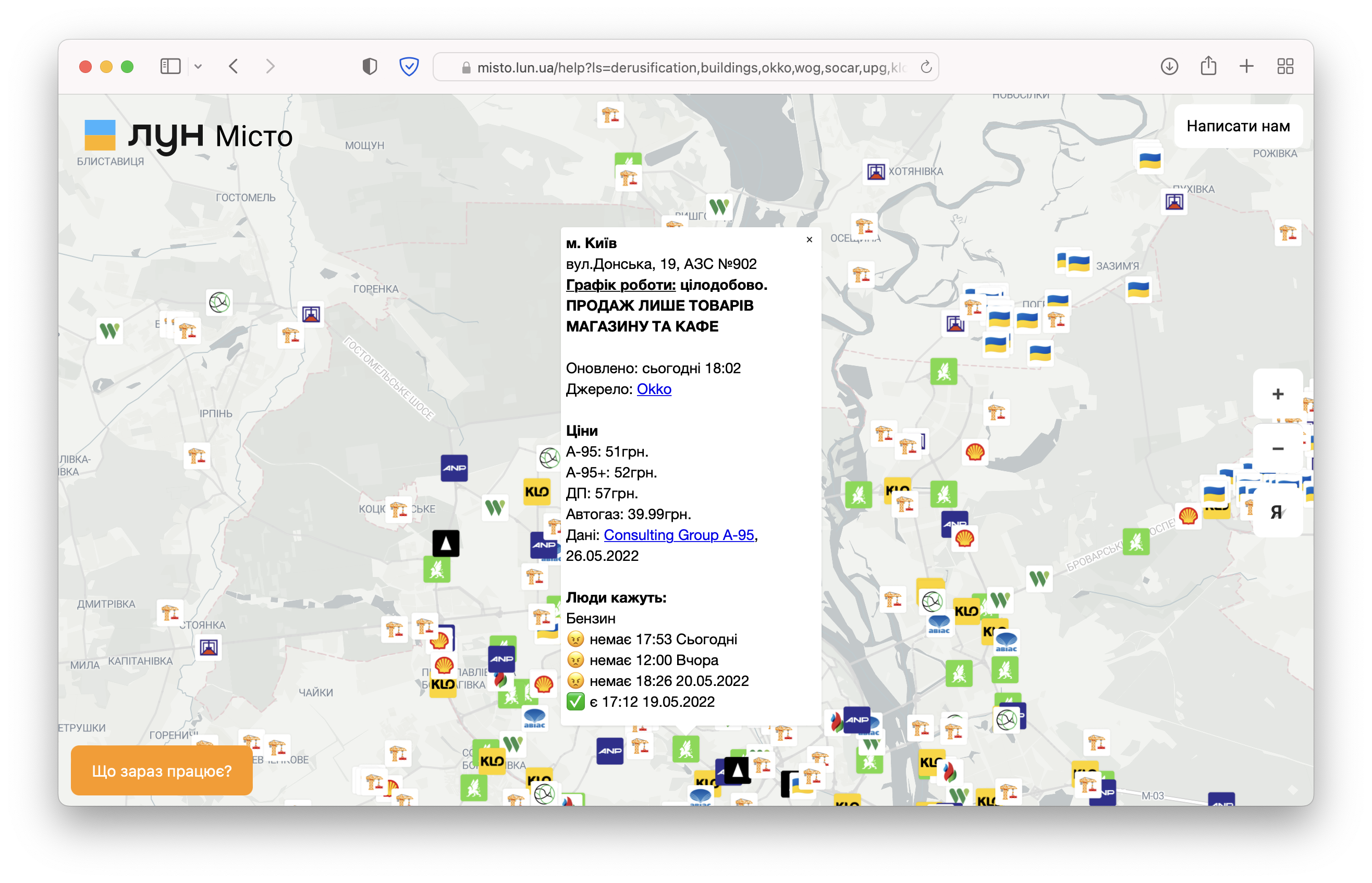 Teraz użytkownicy mogą korzystać z mapy, aby w czasie rzeczywistym sprawdzać dostępność i cenę paliwa na stacjach benzynowych. Dodatkowo możesz sprawdzić kolejkę, poznać adres oraz zaktualizować informacje o dostępności paliwa, jeśli jesteś na jednej ze stacji. Do tej pory na mapie znajdują się stacje paliw następujących firm: WOG, UPG, Avias, Ukrnafta, Chipo, KLO, OKKO, Shell, SOCAR, UPG i Avantage7.
