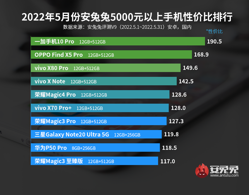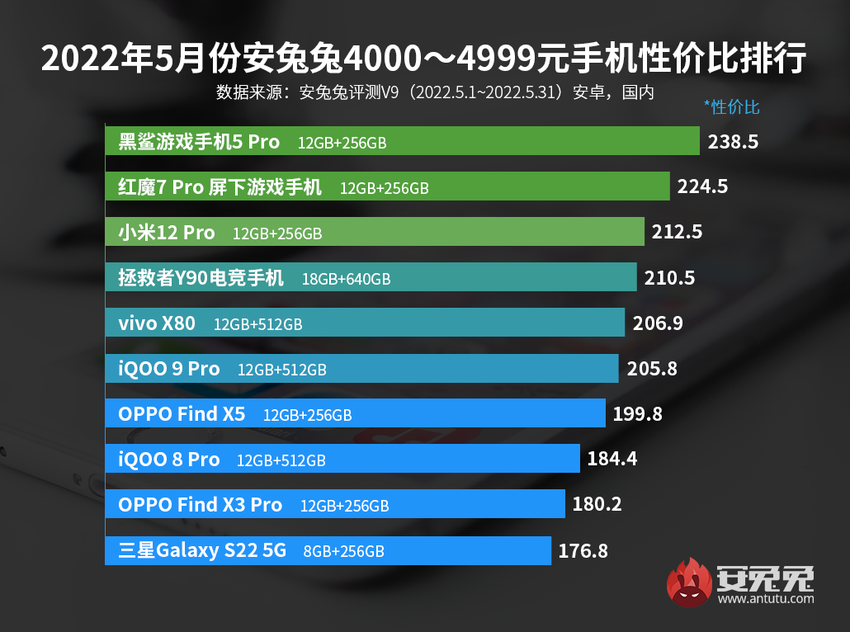 Lider w segmencie 600-750 USD Czarny rekin 5 Zawodowiec. Na drugim miejscu był nubia Czerwona Magia 7 Zawodowiec, a trzeciego Xiaomi 12 Zawodowiec. W najlepsza dziesiątka Również jest Lenovo Legion Y90, vivo X80, iQOO 9 Pro, OPPO Znajdź X5, iQOO 8, OPPO Znajdź X3 Pro oraz Samsung Galaxy S22 na Lwia paszcza 8 Gen1.
