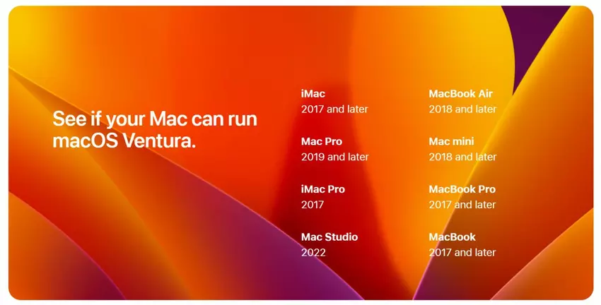macOS Ventura będzie działać na komputerach stacjonarnych i laptopach z procesorami Intel i Apple M, począwszy od modeli MacBook (Pro) i iMac (Pro) z 2017 roku.