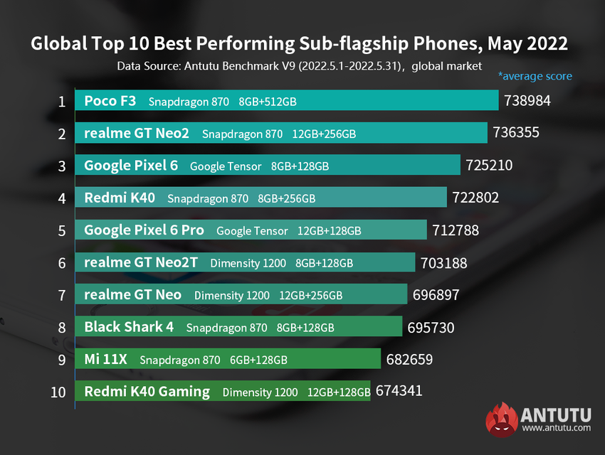 W pierwszej dziesiątce znalazły się modele na procesorach near-top. Prowadzący POCO F3 dnia wyżlin 870. Co ciekawe, jego odpowiednik Redmi K40 zajmuje dopiero czwarte miejsce. Dotarłeś do pierwszej trójki Realme GT Neo 2 i Piksel Google 6 i wersja Zawodowiec zaokrąglono pierwszą piątkę