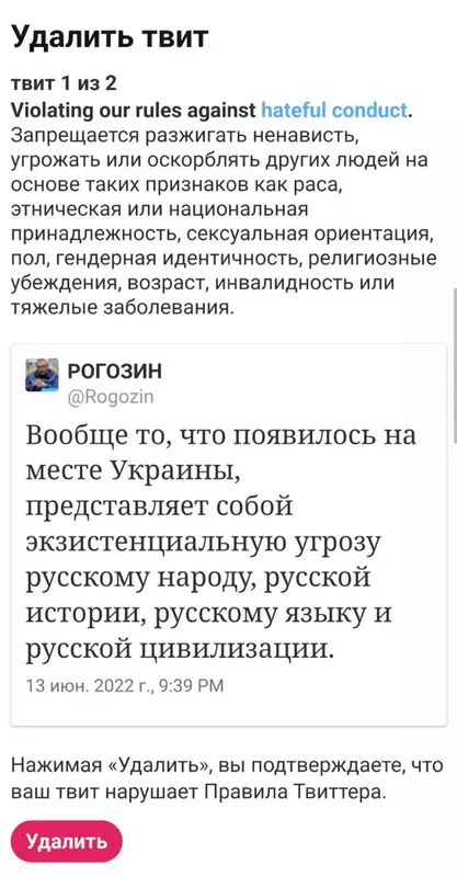Moderatorzy portalu społecznościowego zażądali od szefa Roskosmosu usunięcia wpisu. Do tego czasu nie będzie mógł korzystać ze swojego konta w Świergot. Zrzut ekranu Rogozina zawiera wiersz „tweet 1 z 2”. Podobno moderatorzy żądają usunięcia dwóch postów.