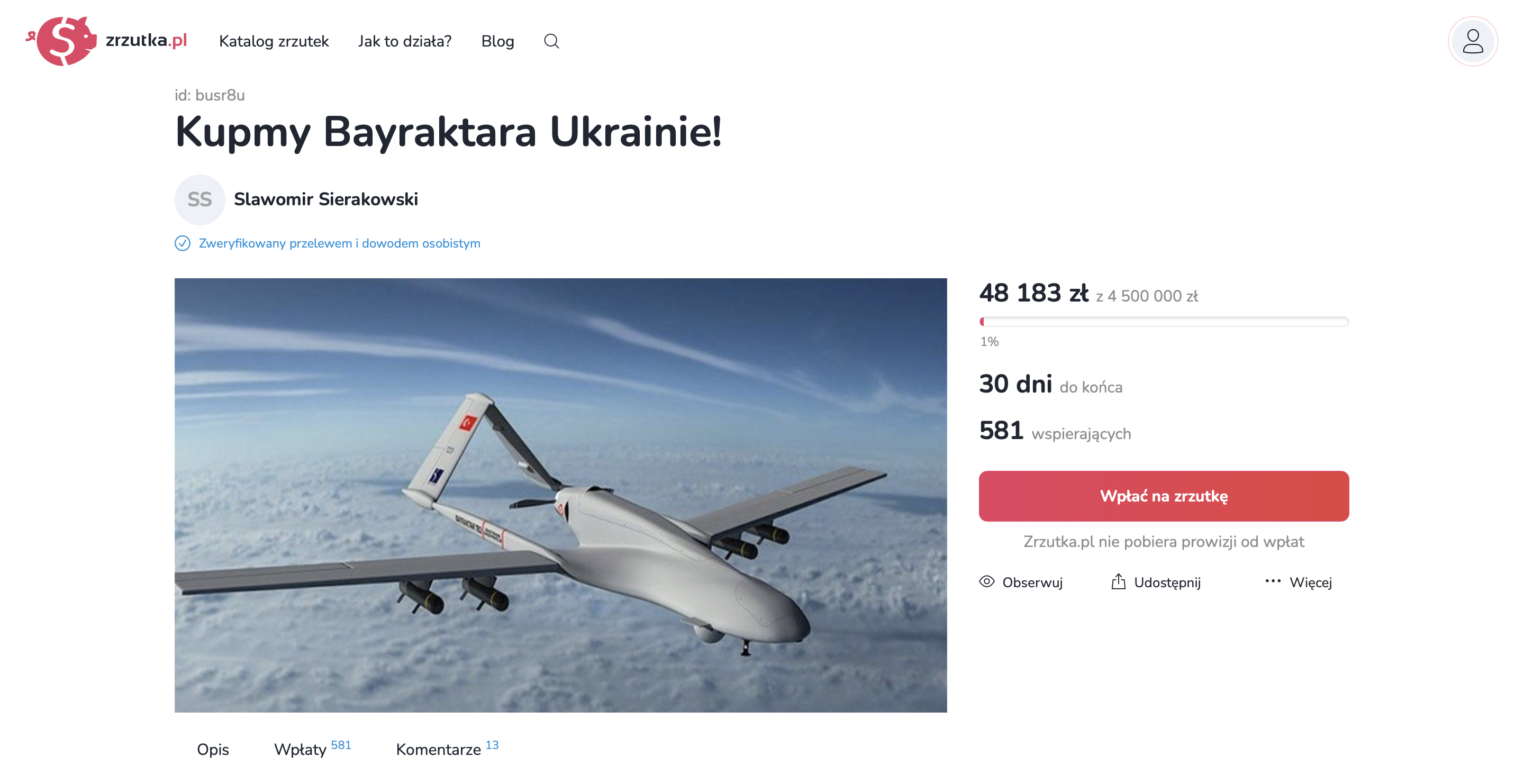 Śladami Litwinów i Ukraińców: Polacy zbierają 4 500 000 zł na Bayraktar TB2 dla Sił Zbrojnych Ukrainy