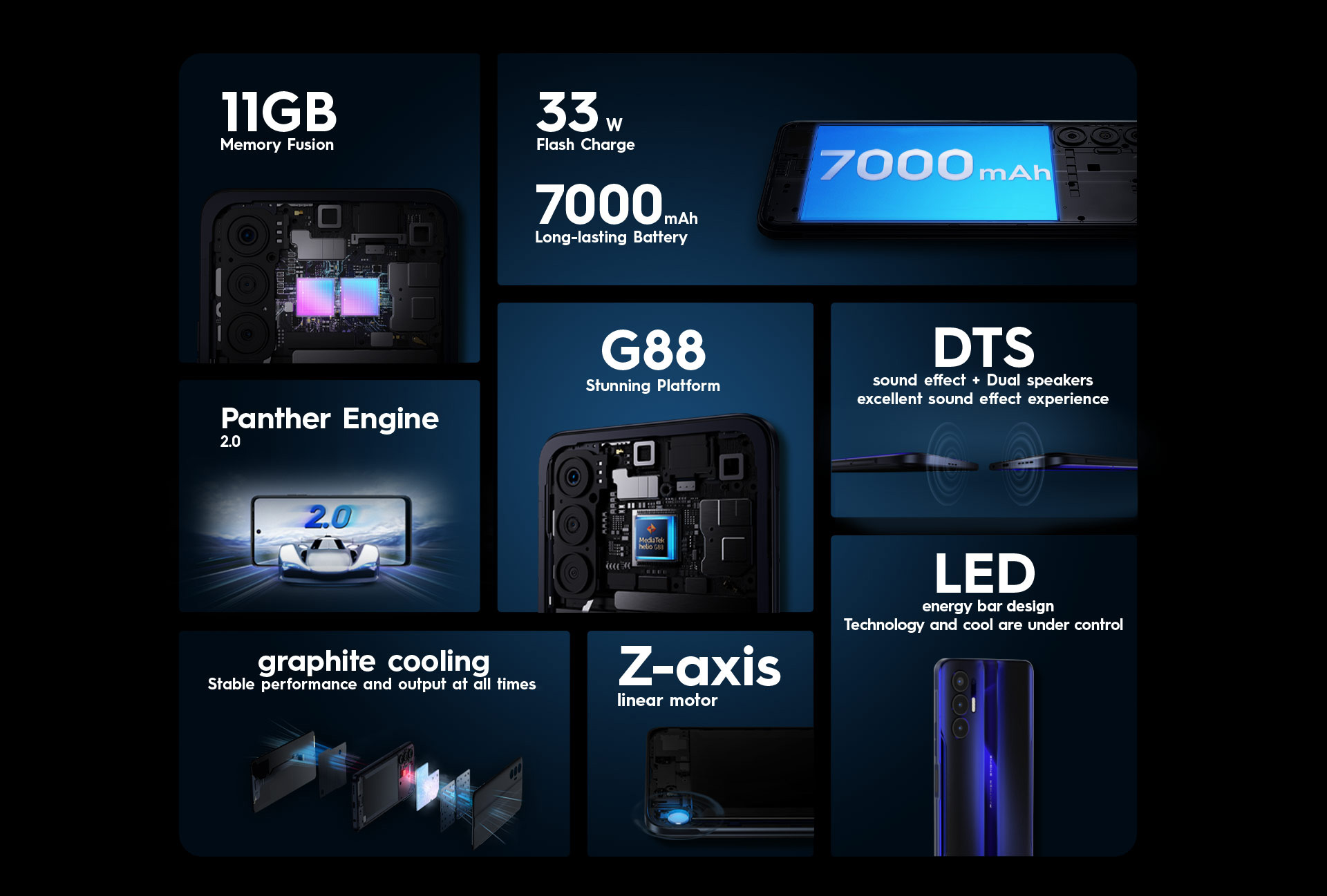 Tecno Pova 3 jest zasilany przez ośmiordzeniowy procesor MediaTek Helio G88. Zasilany jest dużą baterią o pojemności 7000 mAh. Obsługuje szybkie ładowanie 33 W i ładowanie wsteczne 10 W przez port USB-C. Urządzenie ma na pokładzie system operacyjny Android 12.
