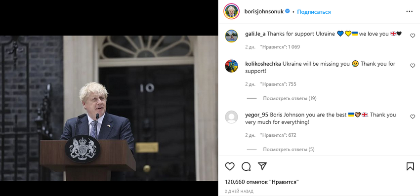 Ponadto Ukraińcy zostawiają słowa wdzięczności na stronie Johnsona w Instagram.