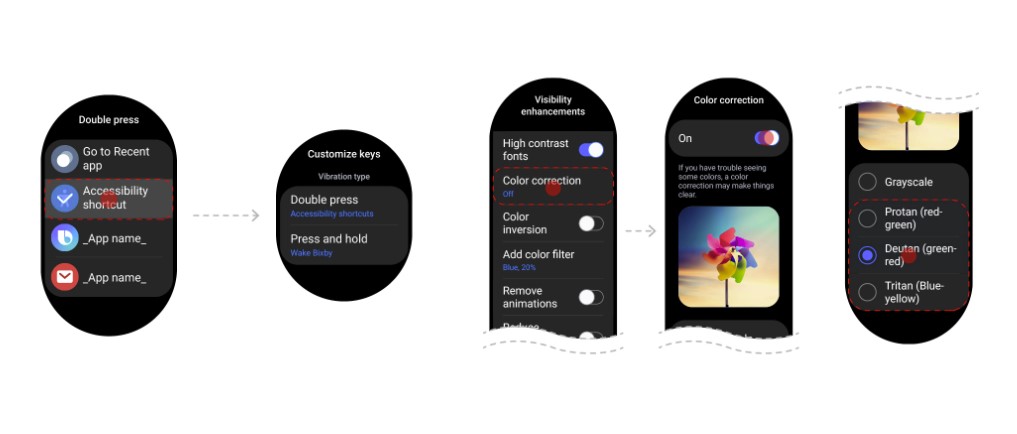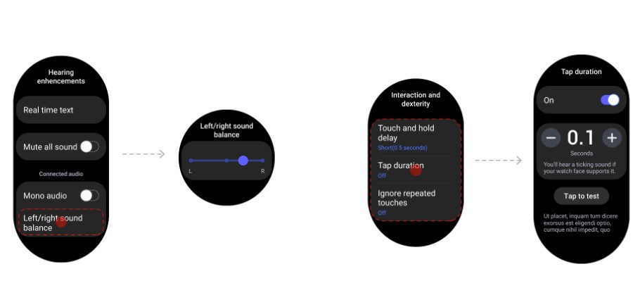 Samsung podkreśla również kilka ulepszeń ułatwień dostępu zawartych w One UI 4.5, które uzupełniają cztery główne punkty. Firma dodaje: Użytkownicy, którzy mają trudności z rozróżnianiem kolorów, będą mogli zmienić odcień i kontrast wyświetlacza, aby czcionki były bardziej czytelne. Inne funkcje pomocy wizualnej obejmują zmniejszoną przezroczystość i efekty rozmycia, a także wyłączenie animacji. Ponadto osobom z wadami słuchu pomoc dźwiękowa pozwala zintegrować dźwięk z podłączonego zestawu słuchawkowego Bluetooth. Osoby, które chcą mieć większą kontrolę nad wprowadzaniem dotykiem, mogą włączyć opcję Czas trwania dotknięcia i ignorować powtarzające się dotknięcia, aby zapewnić lepsze zarządzanie.