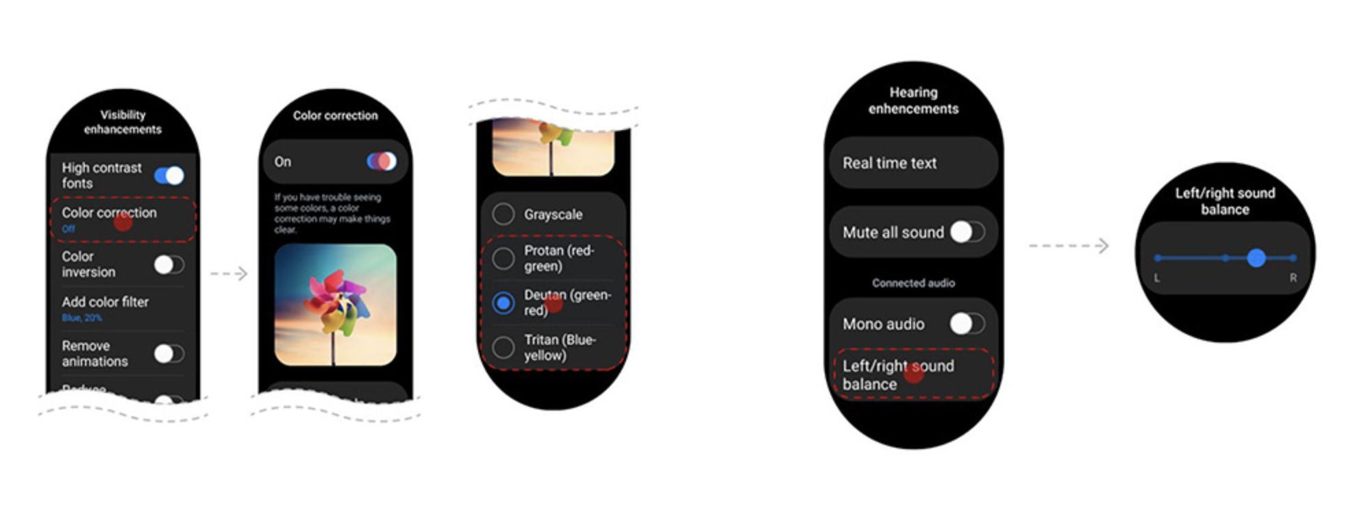 Nawet One UI Watch 4.5 dodał nowe funkcje specjalne. Użytkownicy, którzy mają problemy z wykrywaniem kolorów, będą mogli dostosować odcień ekranu i zwiększyć kontrast. Ponadto będą miały możliwość zmniejszenia przezroczystości i efektów rozmycia, a także wyłączenia animacji.