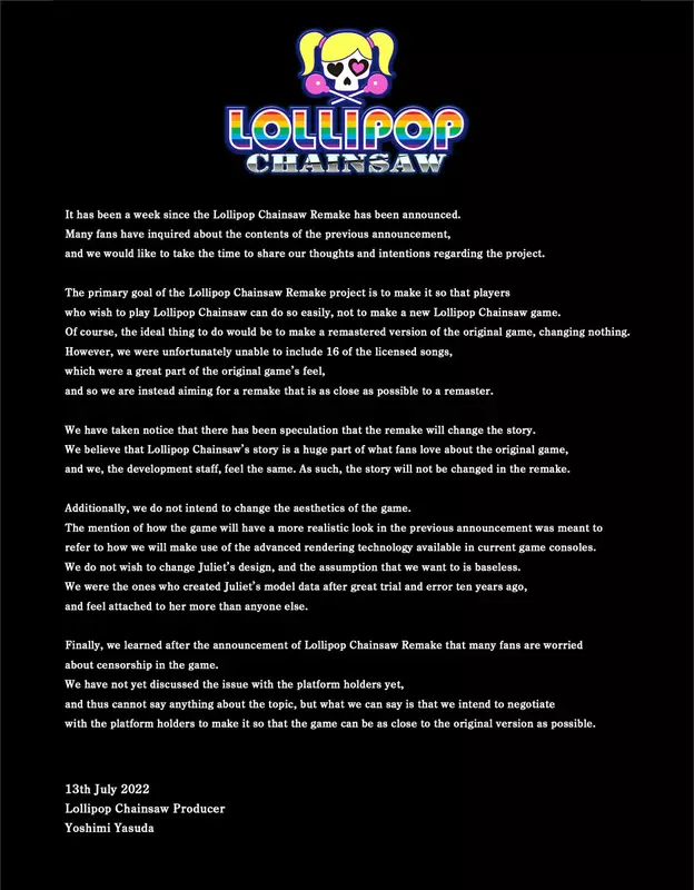 Na początku tego miesiąca pojawiła się informacja, że trwają prace nad remake'em Lollipop Chainsaw - zwariowanego japońskiego slashera o cheerleaderce z piłą łańcuchową. Zapowiedź remake'u od razu zasiała ziarno strachu w sercach fanów oryginału - nie spodobały im się niektóre szczegóły dotyczące nadchodzącej wersji. Producent projektu, Yoshimi Yasuda, próbował rozwiać główne uczucia.