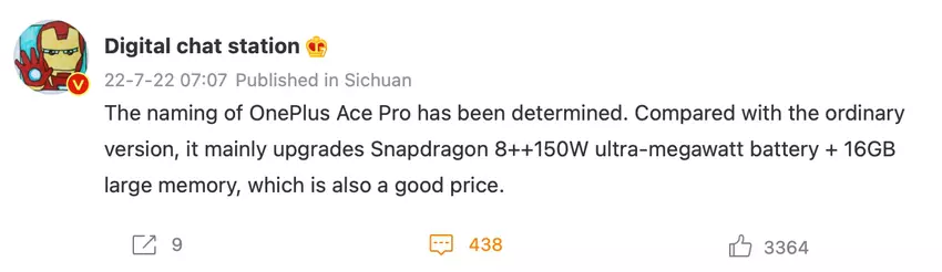 Informacje zostały udostępnione przez osobę z wewnątrz Digital Chat Station. Nowość będzie się nazywać OnePlus Ace Pro. Według informatora smartfon otrzyma flagowy procesor Snapdragon 8+ Gen 1, 16 GB pamięci RAM i ultraszybkie ładowanie 150 W.