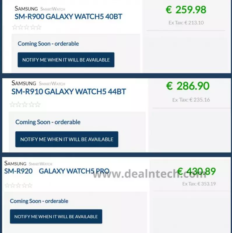 Oczekuje się, że Galaxy Watch5 będzie nieco tańszy niż Galaxy Watch4, według Dealntech. Wersja 40-milimetrowego Watch5 (tylko wariant BT) będzie kosztować 259 euro, podczas gdy edycja 44 mm kosztuje 286 euro. Według doniesień cena Samsung Galaxy Watch Pro z opcją 45 mm tylko BT ma wynieść 430 euro, czyli więcej niż w zeszłym roku 399 funtów.