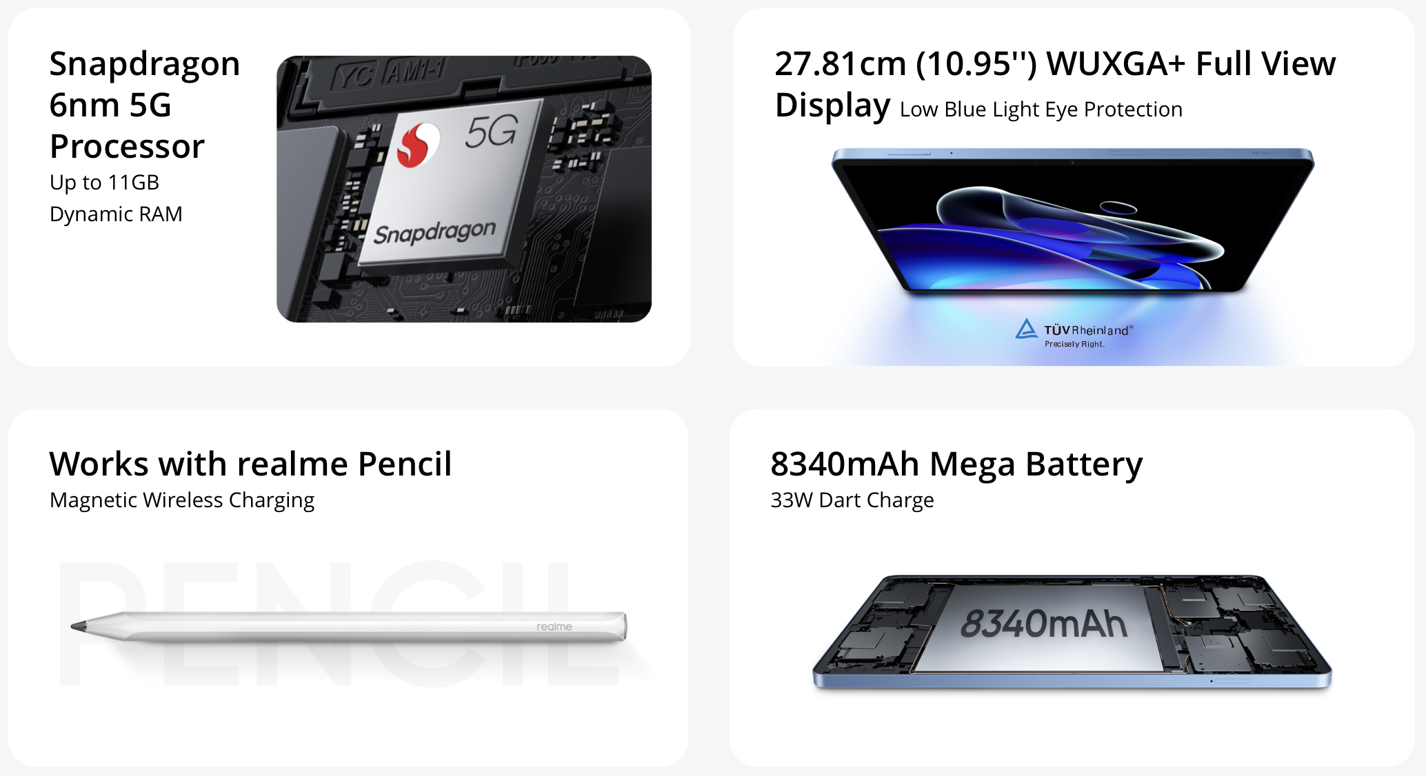 Nowość różni się od modelu na rynek chiński obsługą sieci piątej generacji (opcja). Reszta urządzenia otrzymała te same specyfikacje. Oznacza to, że tablet ma 11-calowy wyświetlacz LCD 2K z obsługą rysika. Pod maską realme Pad X zainstalowano procesor Qualcomm Snapdragon 695. Układ jest sparowany z 4/6 GB pamięci RAM. Nowość ma też cztery głośniki z obsługą Dolby Atmos i Hi-Res Audio, akumulator o pojemności 8340 mAh z szybkim ładowaniem 33 W oraz dwa aparaty: główny 13 MP i przedni 8 MP. Po wyjęciu z pudełka urządzenie ma system operacyjny Android 12 i zastrzeżony interfejs realme UI 3.0 dla powłoki Pad.