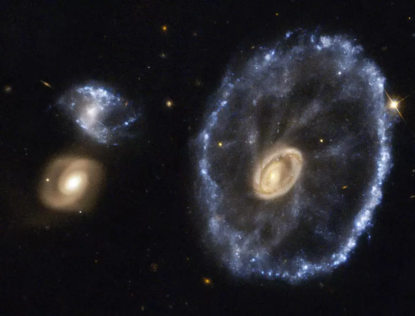 Galaktyka Koło Wozu, znajdująca się w konstelacji Rzeźbiarza około 500 milionów lat świetlnych od nas, była wynikiem zderzenia kolosalnej galaktyki spiralnej z maleńką galaktyką (która od tego czasu zniknęła z pola widzenia). Mniejsza galaktyka wytworzyła fale uderzeniowe, które wzbijały gaz i pył, tworząc efekt falowania podobny do wrzucenia skały na środek jeziora.