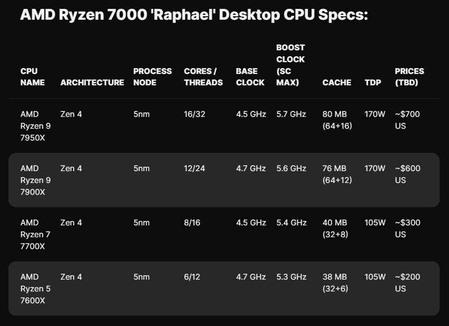 Wycieki związane z platformą AMD AM5 i procesorami z serii Ryzen 7000 wydają się rosnąć z dnia na dzień, a szczegóły specyfikacji, a nawet przedziały cenowe pojawiają się w Internecie. Według Wccftech to, co otrzymujemy, gdy wszystko jest powiedziane i zrobione, może wyglądać tak.