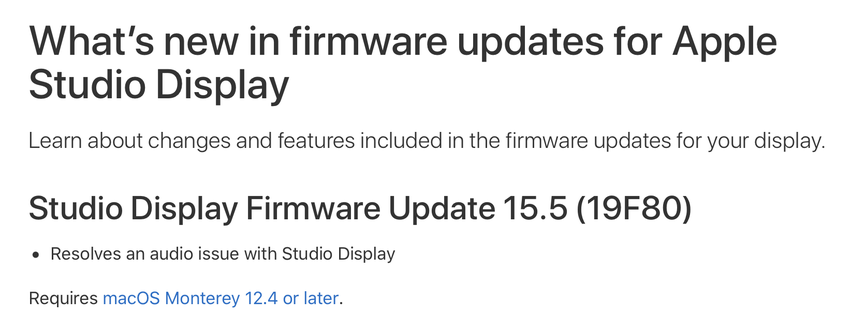 Aktualizacja wydana z numerem kompilacji 19F80. Zgodnie z oficjalną listą zmian, twórcy w końcu naprawili problem z głośnikami urządzenia w oprogramowaniu. Ma to znaczenie od początku sprzedaży Studio Display w marcu.