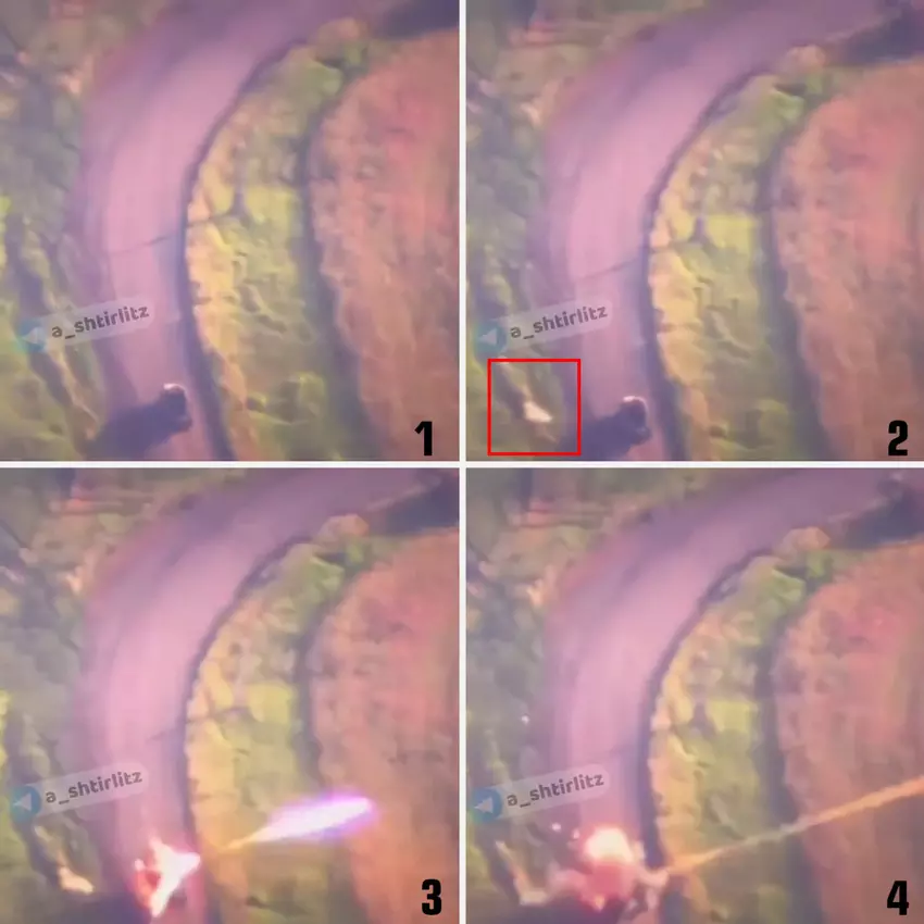 W drugiej klatce powyżej widzimy dym na poboczu drogi. Sugeruje to, że ukraińskie wojsko użyło amerykańskiej miny M93 Szerszeń, który sam może zidentyfikować cel, po czym wystrzeliwuje amunicję z rdzeniem uderzeniowym.
