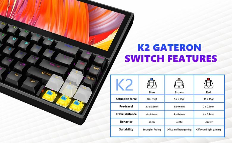 Przełączniki wydają się być również wymienialne przez użytkownika, z niebieskimi, brązowymi i czerwonymi przełącznikami klawiszowymi obsługiwanymi przez przełączniki klawiatury K2 Gateron... Nie jest jednak jasne, który styl jest dostępny jako opcja predefiniowana w Amazon.