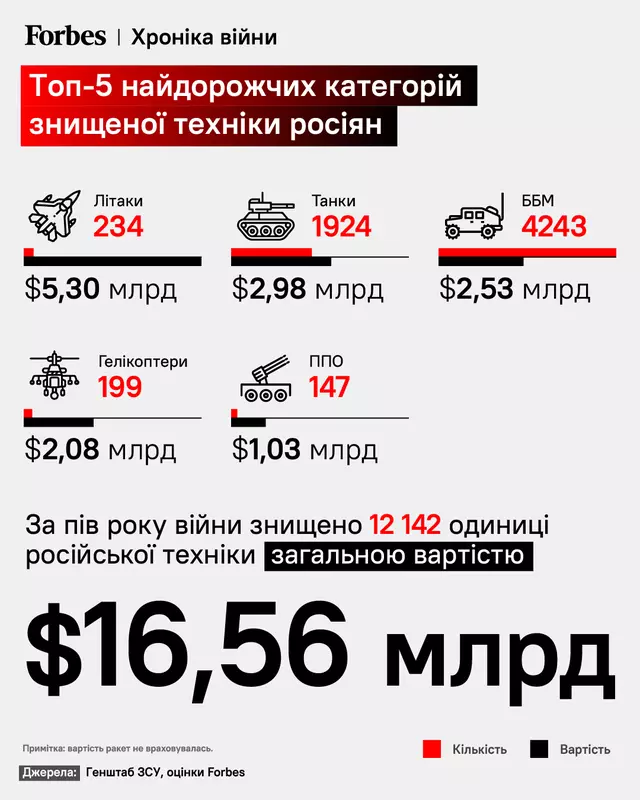 W ciągu sześciu miesięcy Rosjanie stracili 12 142 sztuki sprzętu o wartości 16,56 miliarda dolarów, przy czym ta kwota nie obejmuje pocisków. Tylko w ciągu pierwszych dwóch miesięcy inwazji na pełną skalę zostali zestrzeleni o 7,5 miliarda dolarów.