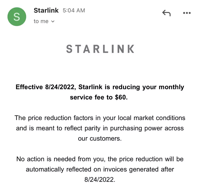 „Od 24.08.2022 r. Starlink obniża miesięczną opłatę za usługę do 60 USD. Obniżka ceny uwzględnia warunki na lokalnym rynku i powinna odzwierciedlać parytet siły nabywczej naszych klientów ”- mówi komunikat.