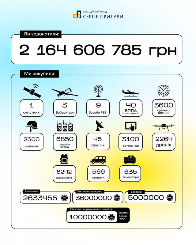 Fundacja Charytatywna Siergieja Prytuli podzieliła się danymi o funduszach zebranych przez 6 miesięcy po inwazji na Rosję na pełną skalę. Od 24 lutego do 24 sierpnia na konta Prytuli i jego funduszu przekazano 2 164 606 785 hrywien!