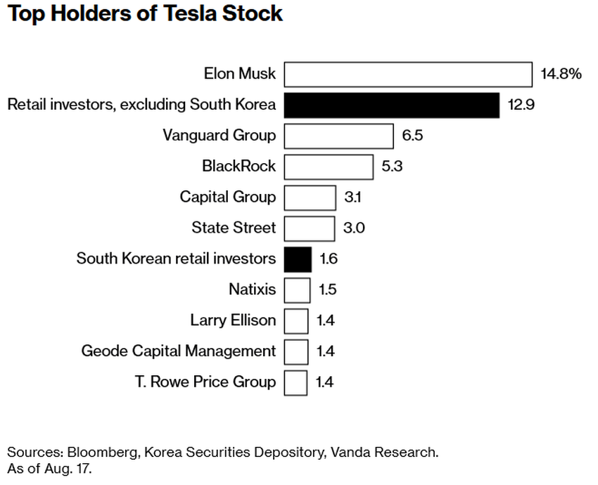 Zauważ, że inwestorzy z Korei Południowej należą do dziesięciu największych udziałowców Tesla. Mieszkańcy republiki kupili 1,6% papierów wartościowych o wartości ponad 15 miliardów dolarów.Dla porównania były prezes Wyrocznia Larry Ellison (Larry'ego Ellisona) posiada 1,4% udziałów.
