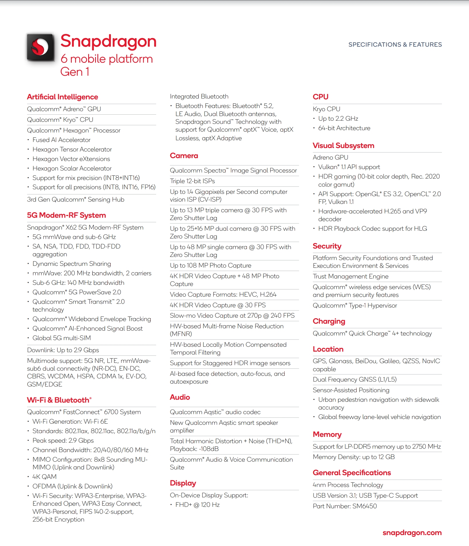 Za połączenie w nowym produkcie musi odpowiadać modem Snapdragon X62. Będzie obsługiwać sieci 5G mmWave i sub-6GHz. Smartfony oparte na Snapdragon 6 Gen 1 będą wyposażone w ekrany FHD+ i częstotliwość odświeżania do 120 Hz. Ponadto otrzymają wsparcie dla Qualcomm FastConnect 6700 WiFi 6E, Bluetooth 5.2, potrójny aparat z czujnikami 13 MP, podwójny aparat 25 MP + 16 MP i pojedynczy aparat 48 MP.
