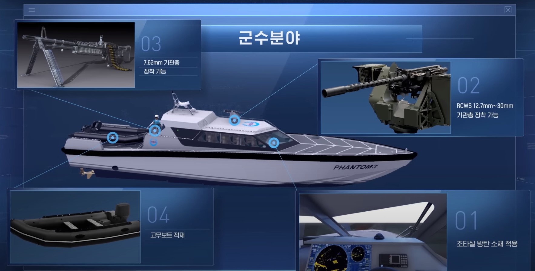 Jeśli chodzi o broń, nowość będzie wyposażona w karabin maszynowy kalibru 7,62 mm oraz moduł bojowy RCWS. Phantom ma być używany do patrolowania i transportu grup bojowych. Kiedy łódź wejdzie do służby w Korei Południowej, wciąż nie wiadomo.