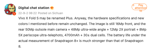 Tak więc, według informatora, początkowo chcieli smartfona nazwać vivo X Fold S, ale ostatecznie wejdzie on na rynek jako vivo X Fold+.